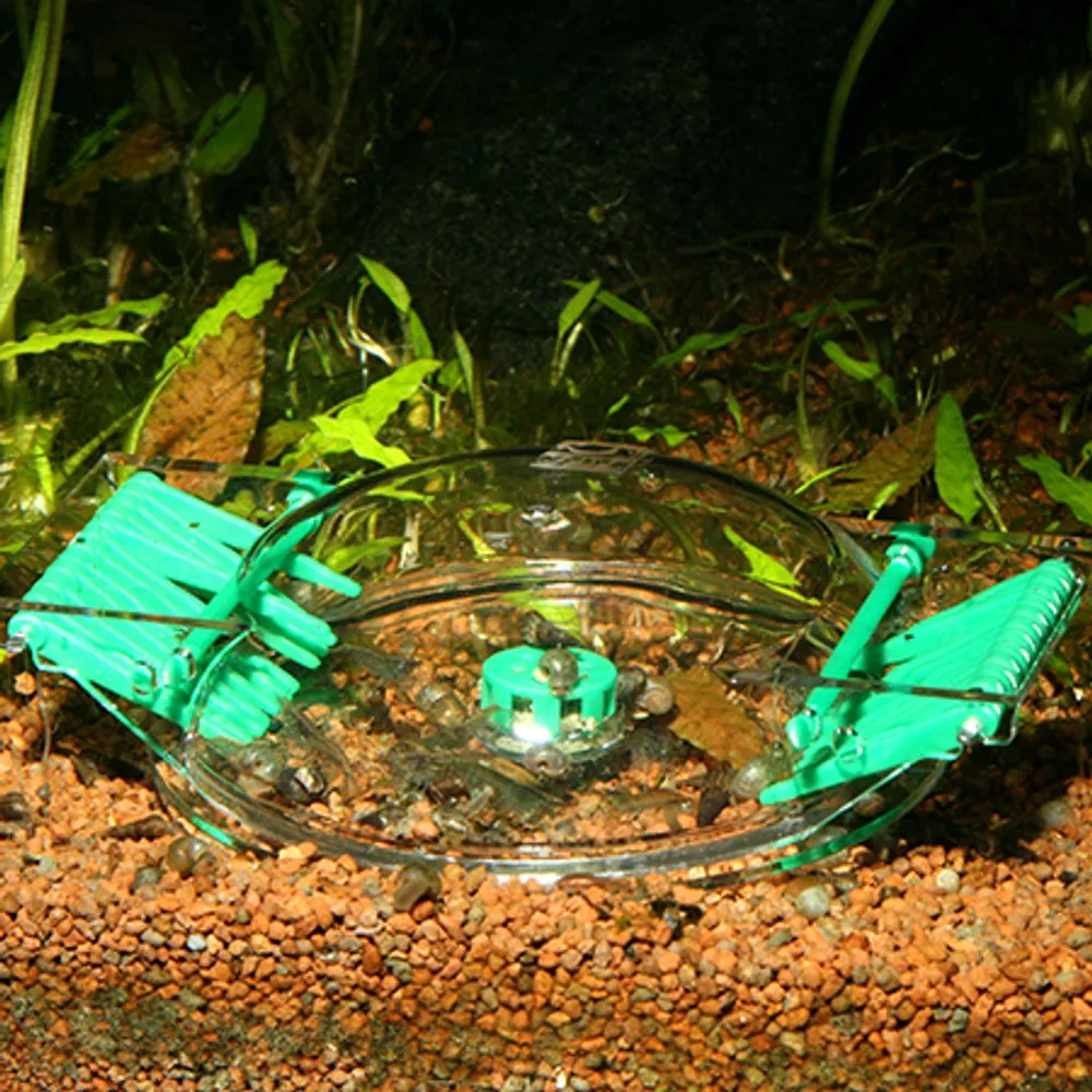 Let at bruge: fyld sneglefælden med mad, placer sneglefælden i akvariet natten over