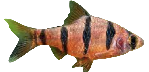 Ligner Tigerbarbe men er mere fredelig; tydelige fem sorte bånd på kroppen; velegnet til selskabsakvarier med rolige fisk; fodres med tørfoder, frossen og levende føde