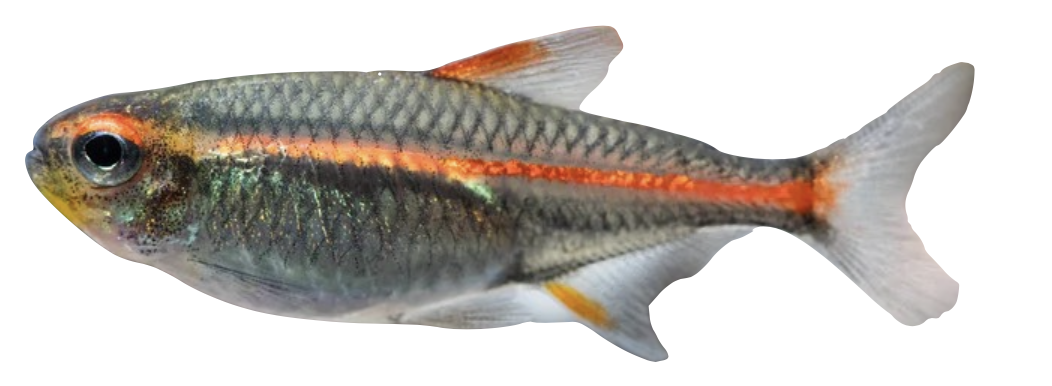 Meget farverig danio med intense orange og blå nuancer; aktiv svømmer der trives bedst i velbeplantede akvarier med god iltning og let strøm; fodres med fint tørfoder, frossen og levende føde