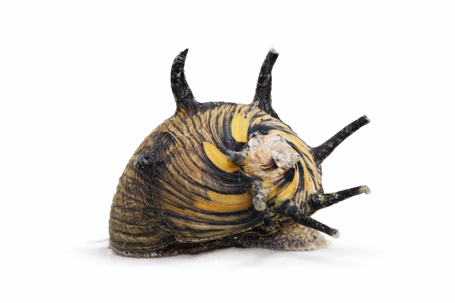 Beskrivelse: En lille og dekorativ algesnegl med karakteristiske “horn” eller pigge på skallen. Farverne varierer fra gul/orange med sorte mønstre til mørkere varianter. Hver snegl har unikt mønster.
