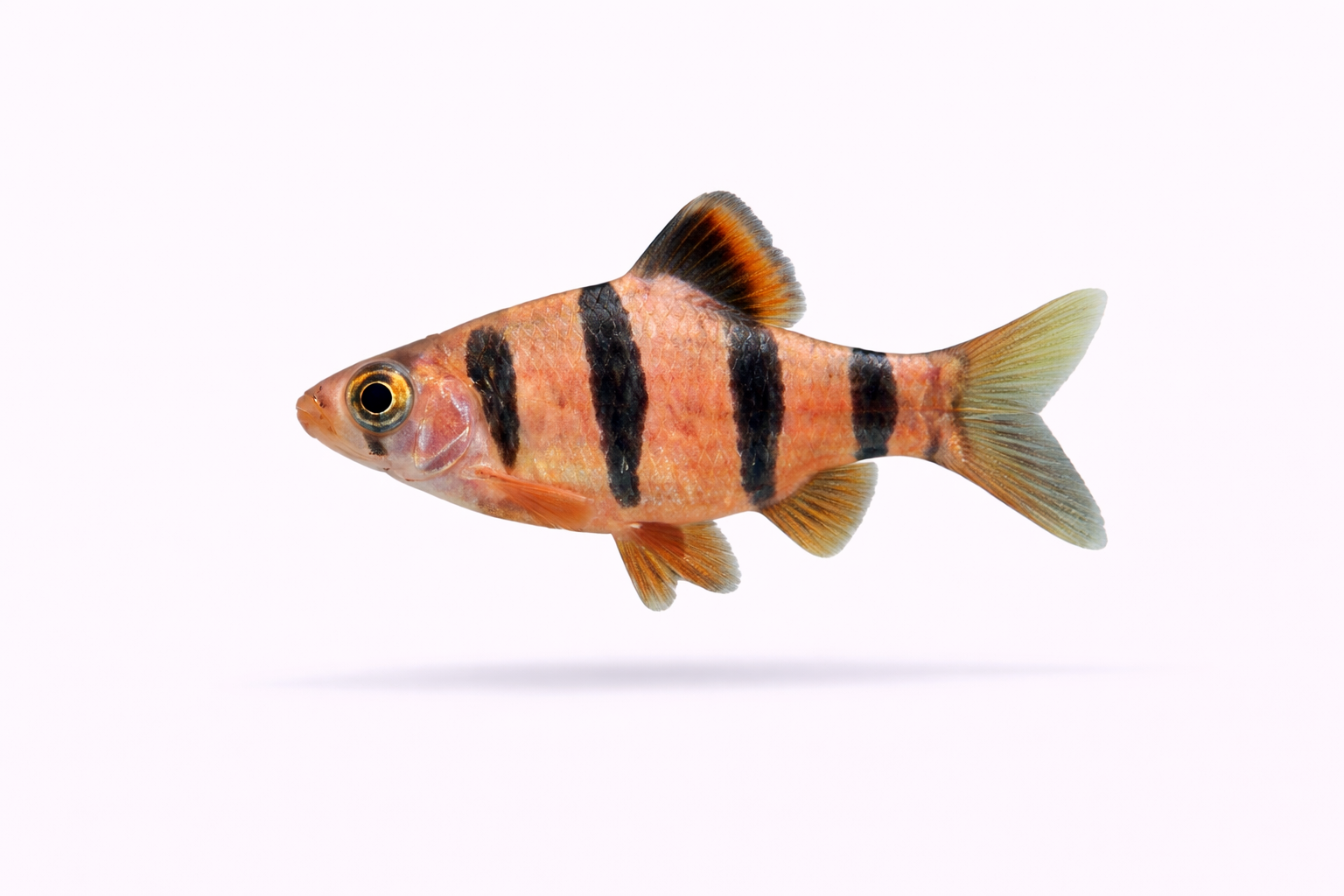 Ligner Tigerbarbe men er mere fredelig; tydelige fem sorte bånd på kroppen; velegnet til selskabsakvarier med rolige fisk; fodres med tørfoder, frossen og levende føde