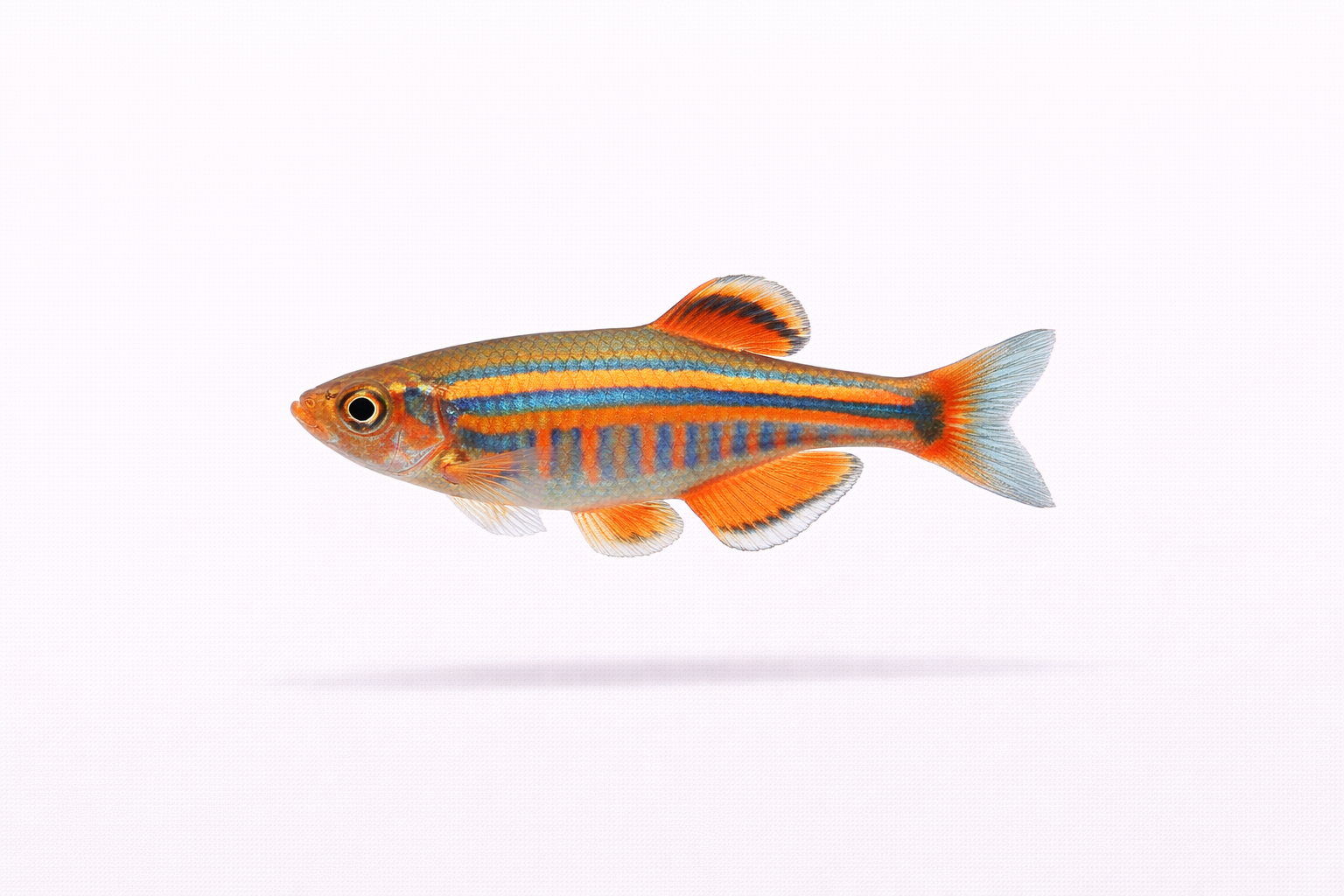 Meget farverig danio med intense orange og blå nuancer; aktiv svømmer der trives bedst i velbeplantede akvarier med god iltning og let strøm; fodres med fint tørfoder, frossen og levende føde