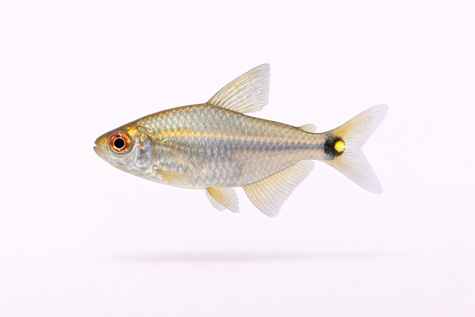 Kendetegnet ved lysende rød/orange stribe langs kroppen og mørk øjefleck nær halefinnen; velegnet til selskabs- og planteakvarier; fodres med tørfoder, frossen og levende føde