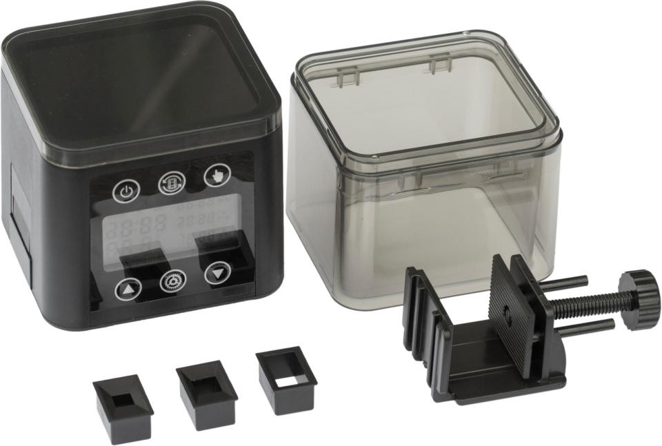Foderautomaten kan indstilles til op til tre automatiske fodringer dagligt og er velegnet til både flage-, granulat- og pillefoder. Den specielt udviklede og meget præcise doseringsenhed sørger for at foderet doseres direkte ned i akvariet – og ikke på akvariets låg. Den er således særdeles egnet til akvarier med en mindre foderåbning.