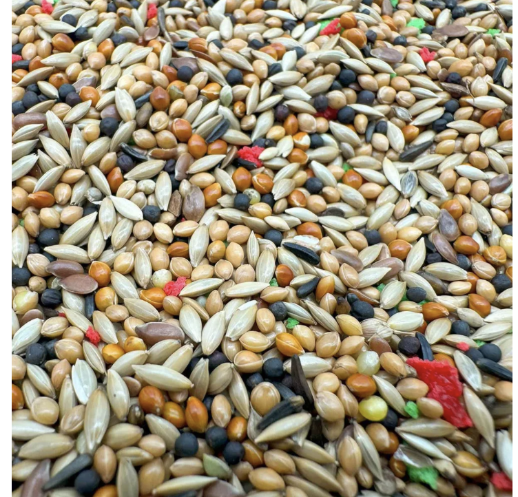 Fodringsanvisning: Kompletteringsfoder til burfugle. Giv fuglene fri adgang til foderet. Suppler med frugt, grøntsager, mineraler og vitaminer. Sørg altid for, at fuglene har adgang til frisk vand.
