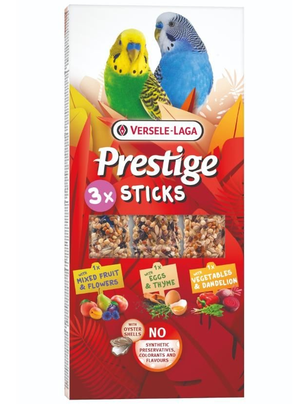 Versele Laga Prestige Sticks til undulater og andre små parakitter med 3 forskellige varianter. Lækre frøstænger uden tilsat sukker og uden syntetiske konserveringsmidler, farve- og smagsstoffer.