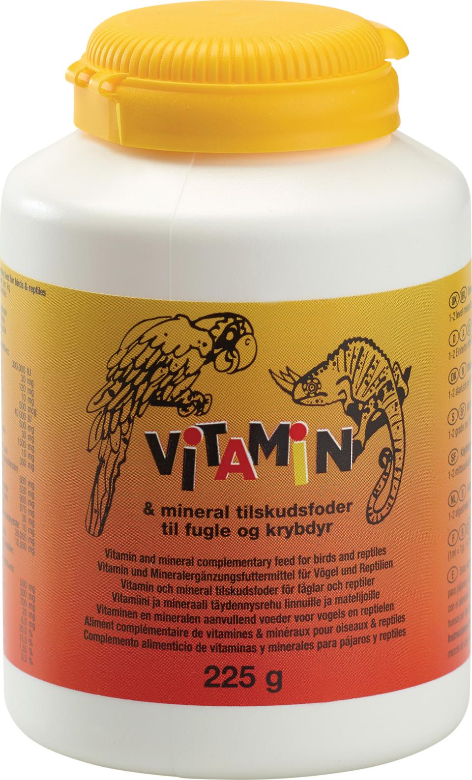 Vitamin og mineral. Vitaminpulver til fugle og krybdyr. Brugsanvisning: Måleske ilagt (1ml = 1g). 1-2 skefulde per 200 g foder. Blandes i foderet.