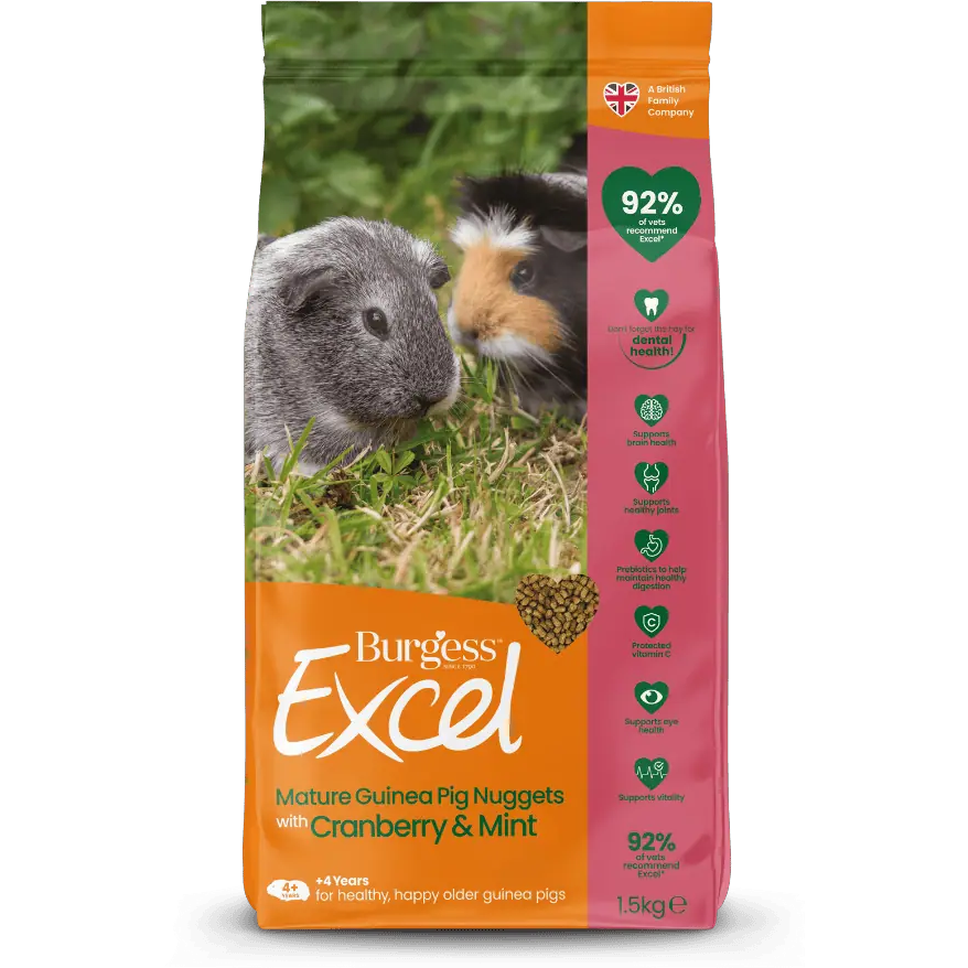 Vores lækre, fiberrige Mature Guinea Pig Excel Nuggets med tranebær og mynte supplerer dine ældre marsvins (4+ år) kost med vitaminer og mineraler og forhindrer selektiv spisning.