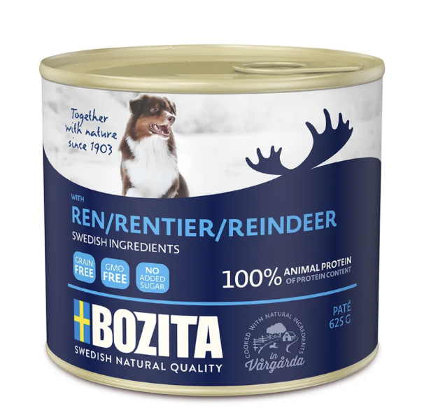 Bozita paté med rensdyr er et kornfrit vådfoder til hunde, som kan anvendes som fuldfoder eller som topping på tørfoder. Rensdyrkødet i denne paté stammer fra fritgående rensdyr i Sveriges nordlige fjeldområder, hvilket giver måltidet en unik smag af vildmark. Bisphenolfri dåser.