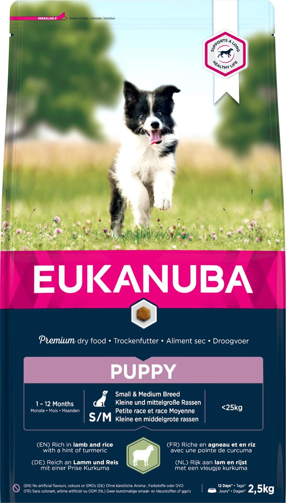 Foderet er 100% komplet og afbalanceret. Med masser af lam og ris er Eukanuba ideel til at opforstre hvalpe af små racer som gravhunde, collier, mops og cocker spaniels.
