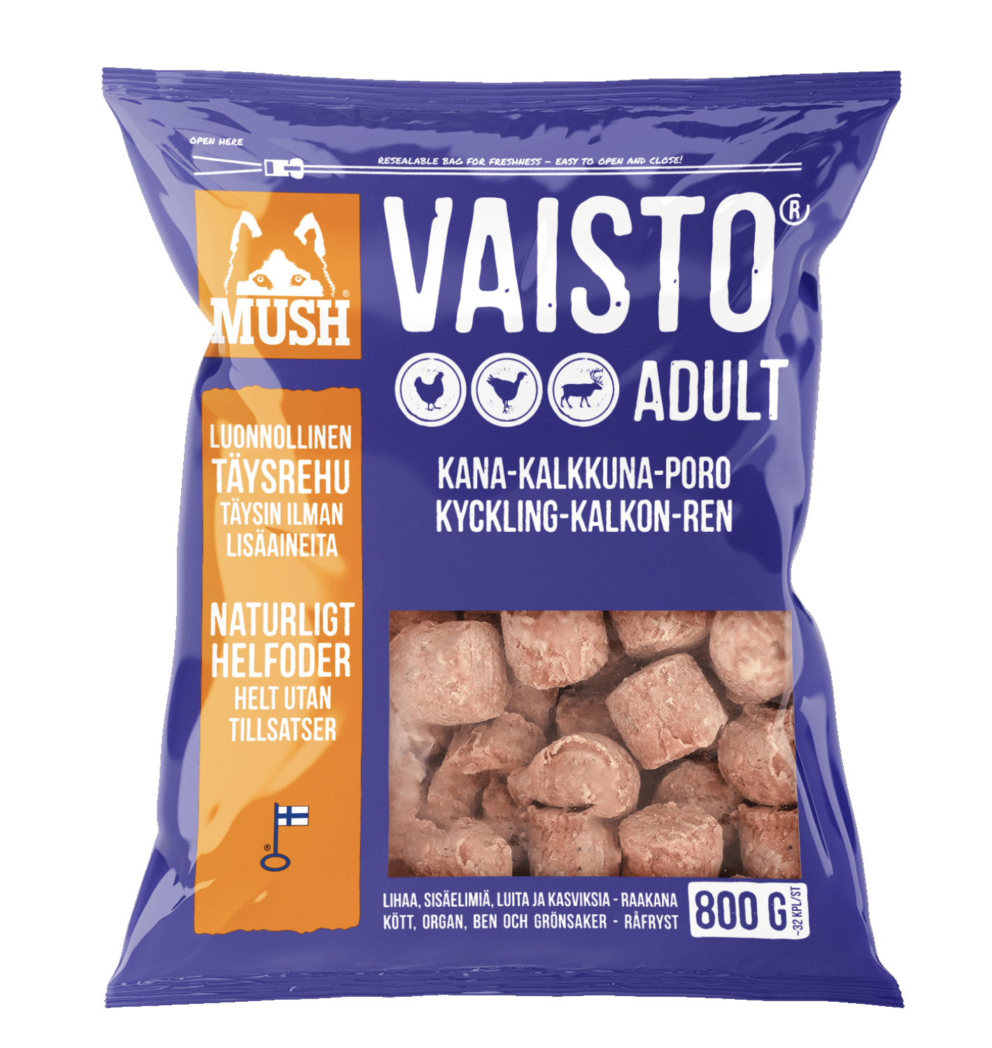 MUSH Vaisto® Lilla (kalkun–kylling–rensdyr) er et komplet BARF-fuldfoder til voksne hunde. Foderet er sammensat af kød, ben og organer fra tre forskellige dyr, kombineret med lidt grøntsager og olie, alt sammen frosset ned i praktiske kødboller á ca. 25 g. Produkterne er 100 % naturlige uden tilsætningsstoffer, konserveringsmidler eller fyldstoffer.