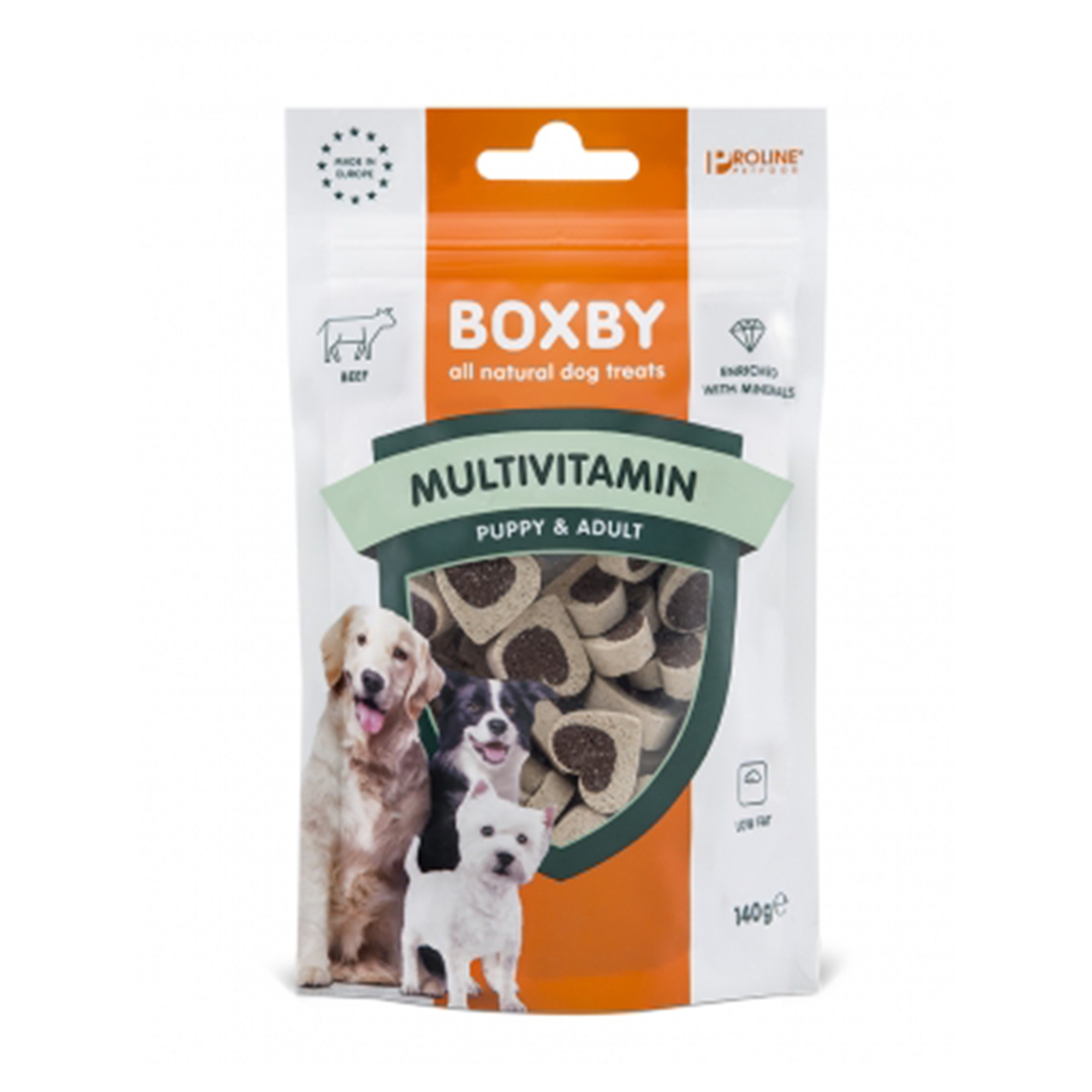 Boxby Proline Multivitamin Snacks er hundegodbidder som er skabt til at give din hund en ekstra dosis vitaminer, mineraler og calcium samtidig med en velsmagende snackoplevelse. De er velegnede til både hvalpe over 3 måneder og voksne hunde.
