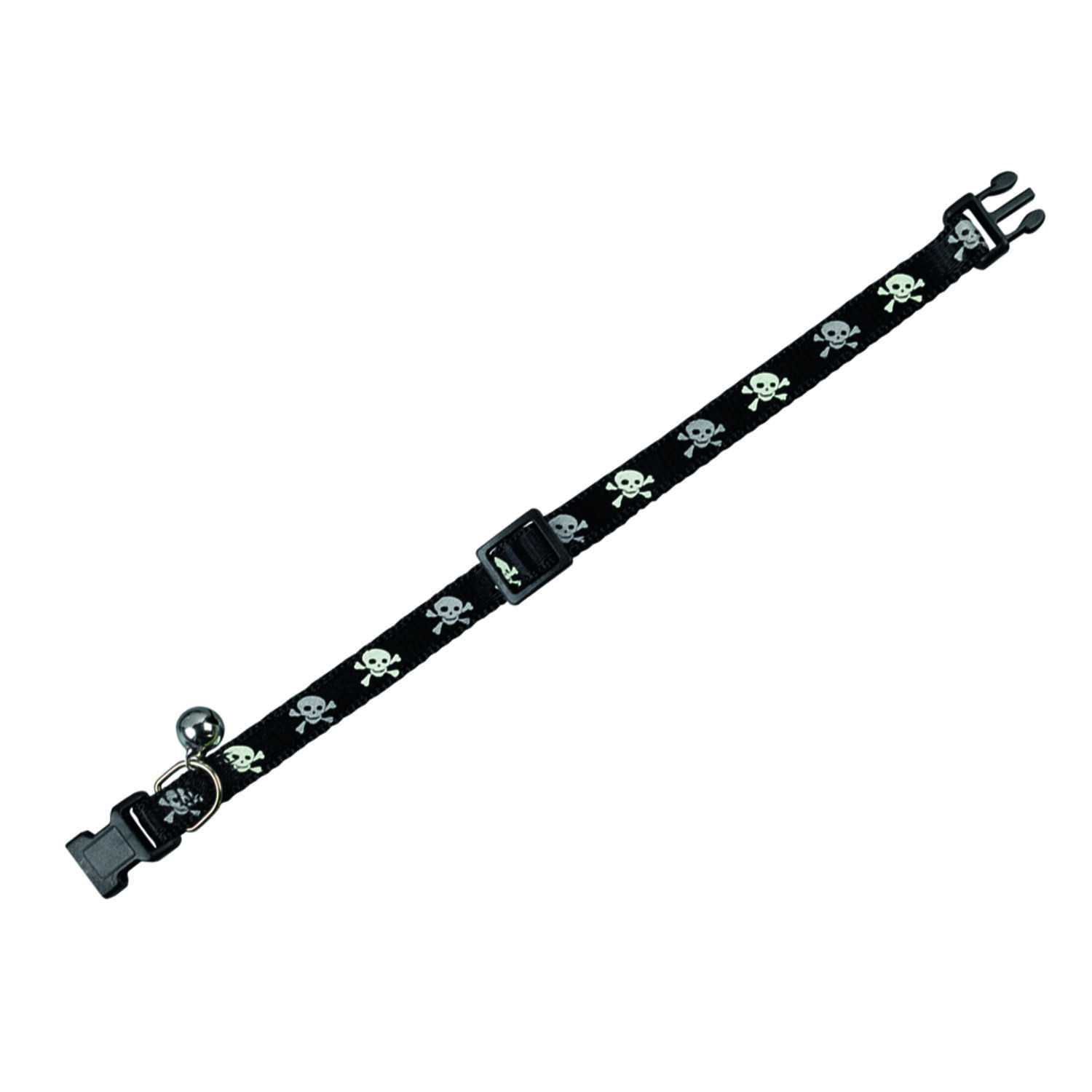 Kattehalsbånd i nylon med dødningehoved-mønster.