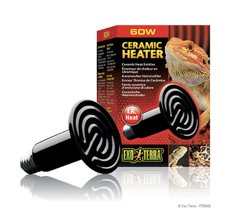 Keramisk varmelampe, som udsender infrarød stråling, der opvarmer dyret og terrariet. Varmen kommer ovenfra, præcis som i naturen. Kan bruges både dag og nat.